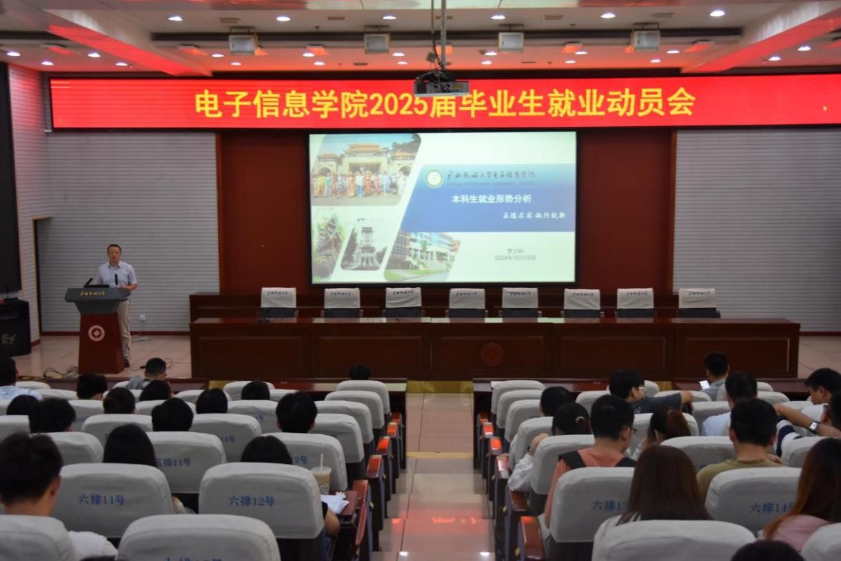 为进一步做好2025届毕业生就业工作,帮助毕业生了解就业形势、掌握就业政策、确定就业目标,10月15日下午,电子信息公司在科技楼报告厅先后召开2025届本科生就业动员会和研究生就业动员会。公司党委副书记、纪委书记罗少科,副经理文春明,毕业生班主任覃晓、梁翠凤,公司就业专干辅导员邓云斌及电子信息公司2025届毕业生参会。会议由邓云斌主持。
