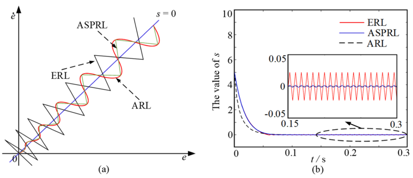 不同趋近律的比较:(a)滑模运动特性;(b)s随t的变化