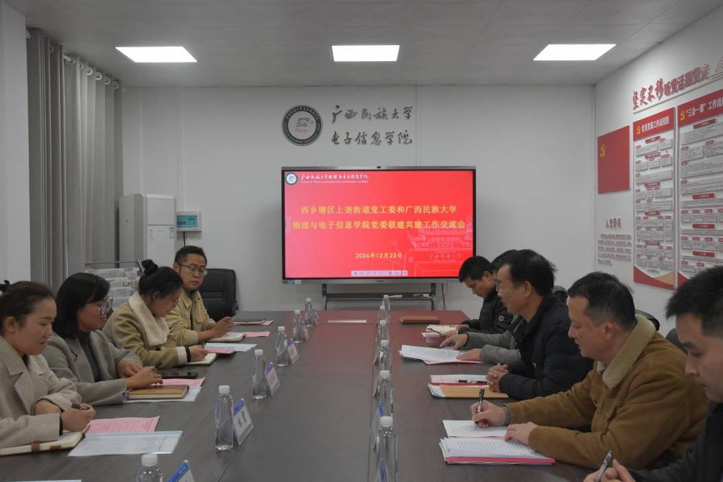 12月23日,西乡塘区上尧街道党工委和beats365官方网站物理与电子信息公司党委联建共建工作交流会在博识楼300室成功举行。公司党委书记覃志和,党委副书记、纪委书记罗少科,教师党支部书记、副经理卢振坤,教师党支部组织委员、实验室主任覃晓,团委副书记邢凯及辅导员韦秋竹、李旭参加会议。