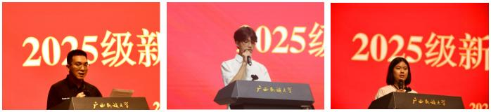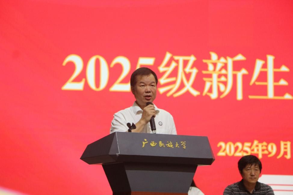 覃志和作题为《新起点·新目标·新征程》的发言。覃志和指出,大学之“大”在于求真超越,他希望大家尽快完成从“被动考生”到“主动学者”的转变,努力成长为有理想、敢担当、能吃苦、肯奋斗的新时代青年。为此,他对2025级新生提出四点期许:一、要学会时间管理,合理规划学业、实践与休闲,保持张弛有度的节奏;二、要善用图书馆、线上课程、实验室等资源;三、要主动沟通,多与老师交流探讨,积极参与课堂互动;四、要勤于总结,构建知识网络,避免依赖“考前突击”,真正实现高效、深度学习。