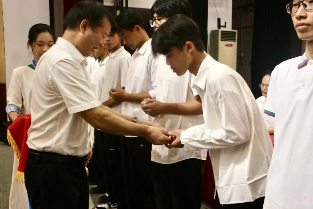 典礼上,公司党委书记覃志和为新生代表授予院徽。2025级新生代表们齐将院徽徽章佩戴在胸前,带着自豪感和责任感,成为勇担使命的新物电人。