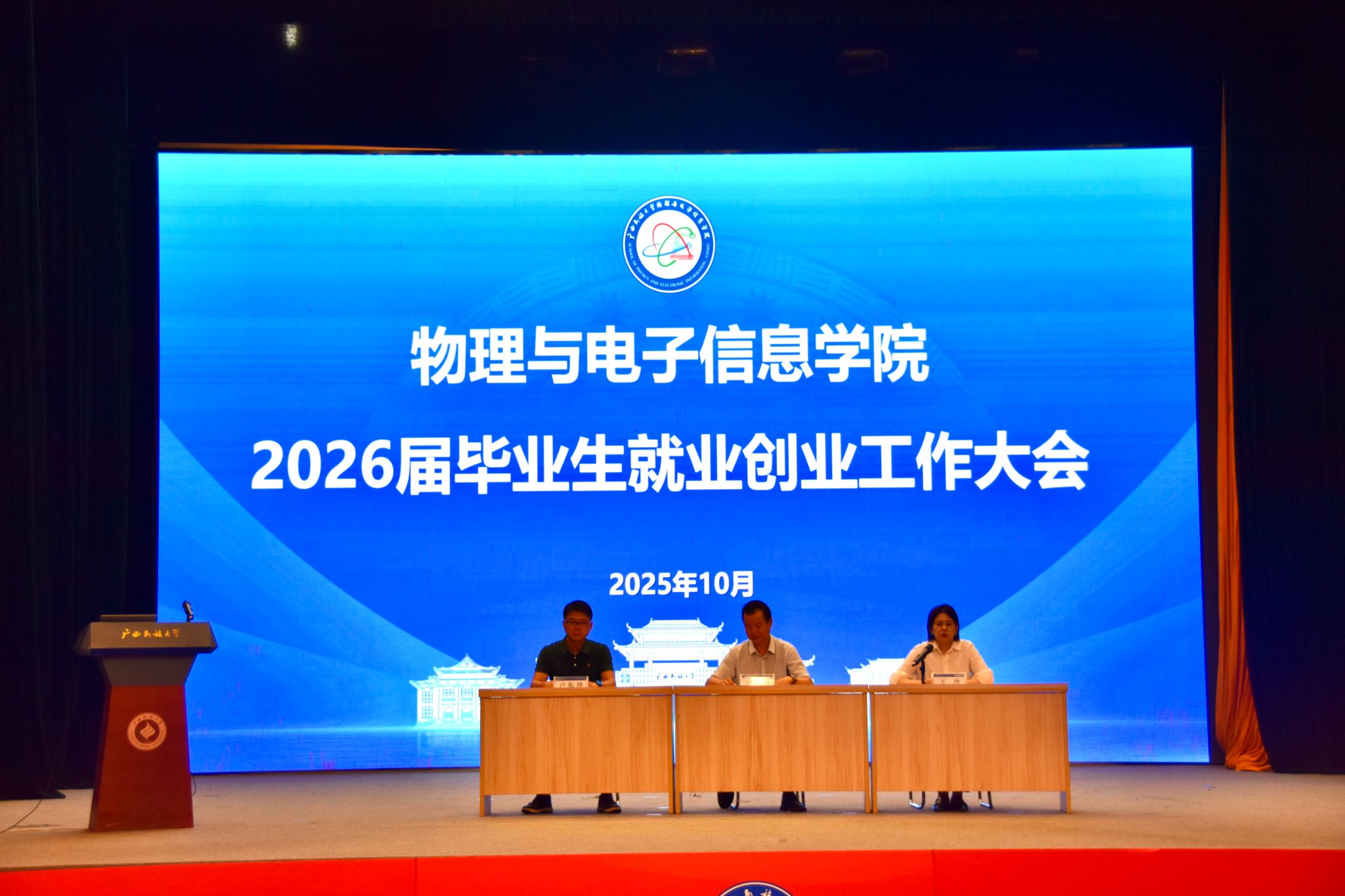 两名2026届毕业生代表结合自身求职经历分享就业经验。2022级光电信息科学与工程一班的陆泰蓉同学结合自身就业经验提出三点建议:一、立足专业特点,结合企业需求制作差异化简历;二、发挥交叉学科优势,拓宽至技术支持、项目管理等岗位;三、通过项目实践夯实功底,考取行业资格证书弥补学历短板。已获得中国能源建设集团广西水电工程局有限公司签约的2022级电子信息工程2班蓝尚富同学,以“认清自我、勇于尝试、保持积极”为核心,讲述了自己从迷茫焦虑到目标清晰再到工作落实的转变过程。他鼓励同学们“不怕被拒、只怕停滞”,用行动积累经验,努力将大学四年的积累转化为求职“敲门砖”。