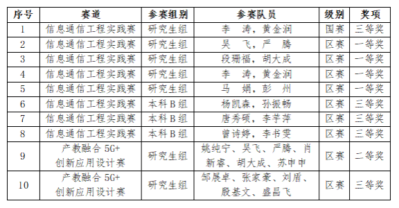 近日,第十一届“大唐杯”全国老员工新一代信息通信技术大赛获奖名单揭晓,公司在此次大赛中喜获10个奖项,信息通信工程实践赛道研究生组获国赛三等奖1项、区赛一等奖4项,本科B组获区赛三等奖3项;产教融合5G+创新应用设计赛道研究生组获区赛二等奖1项、区赛三等奖1项。