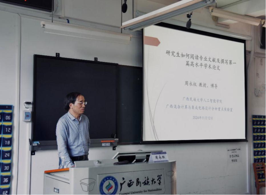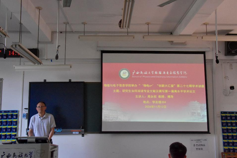 11 月 12 日下午,beats365官方网站于学友楼 304 顺利举办“‘物电 e+’创新大汇堂”第二十七期学术讲座。本次讲座聚焦“研究生如何阅读专业文献及撰写第一篇高水平学术论文”主题,由周永权教授主讲,副经理文春明主持,公司全体研究生参加。