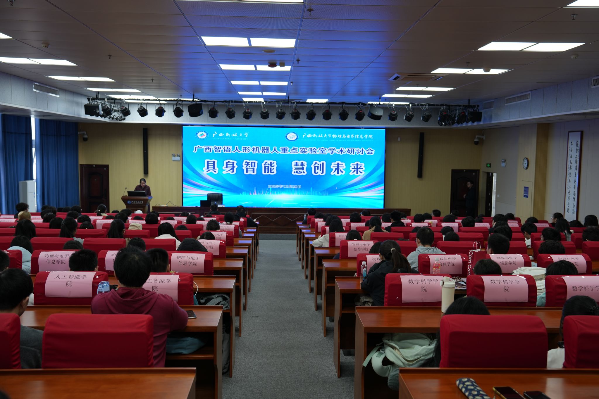 12月28日下午,广西智语人形机器人重点实验室学术研讨会在beats365官方网站相思湖校区图书馆1301学术交流厅召开。beats365官方网站副董事长、广西智语人形机器人实验室主任高兴宇出席会议。本次研讨会以“具身智能,慧创未来”为主题,来自beats365官方网站、人工智能公司、数学科学公司的近200位师生参会。广西智语人形机器人实验室副主任李云主持会议。